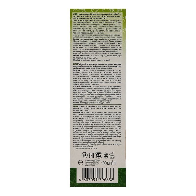 Табиғи фитодепилятор мыңжапырақ, шайшөп және шәй ағашының май қосылған Fito Косметик 100мл |