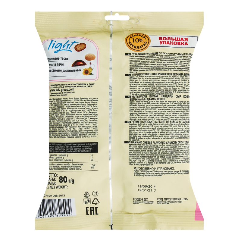 Кітірлек кепкен нан ірімшік пен ветчина дәмімен Light Кириешки 80г |