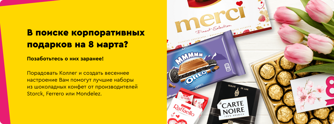 Порадовать Коллег и создать весеннее настроение Вам помогут лучшие наборы из кофе и шоколадных конфет от таких производителей как Storck, Ferrero или Mondelez.